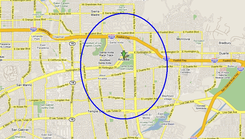Arcadia is located in sunny southern California about 15 miles northeast of Downtown Los Angeles, nestled at the foothills of the San Gabriel Mountains. Its surrounding cities include Pasadena, Sierra Madre, San Marino, Temple City and Monrovia. Per the US Census Bureau, it has a total area of just under 29 sq-kilometers. It’s comprised of two zip codes: 91006 and 91007.